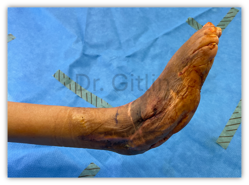 Below is a photo of the patients foot after the removal of the infected bone. You can see the degree of deformity and unusual appearance with no heel bone.