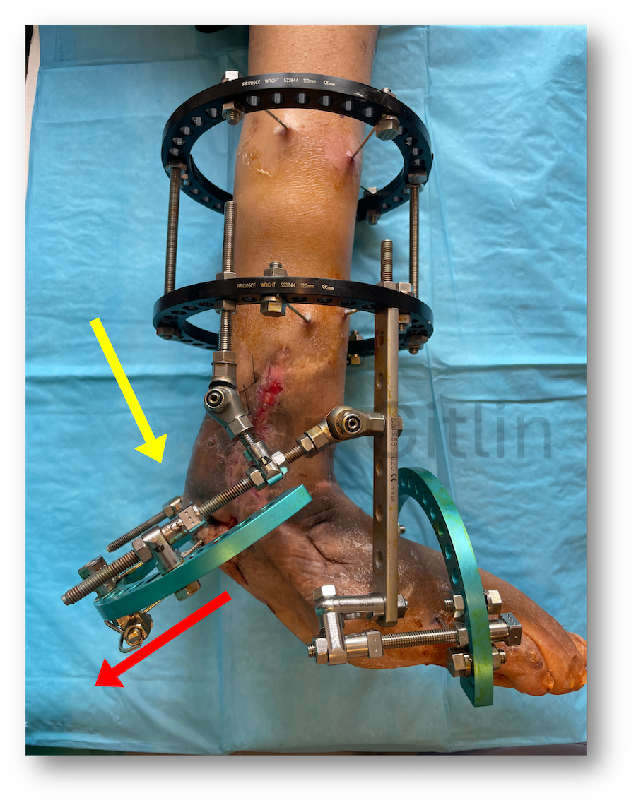 The red arrow and yellow arrows show how we planned to build this external fixator to pull the bone in order to grow a new set of bones in the patients foot and ankle. You can see nuts that the patient will turn once a day in order to have the fixator device pull and lengthen the bones.